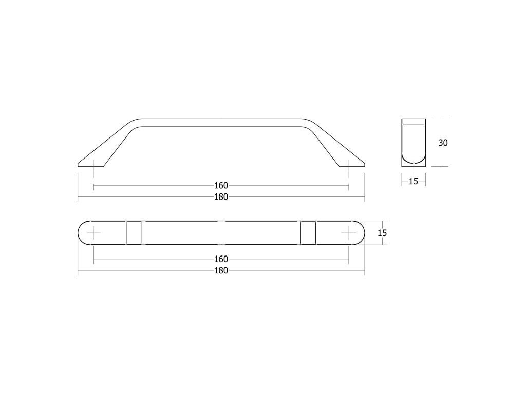 délka 180 mm, šířka 15 mm, výška 30 mm, rozteč 160 mm.
